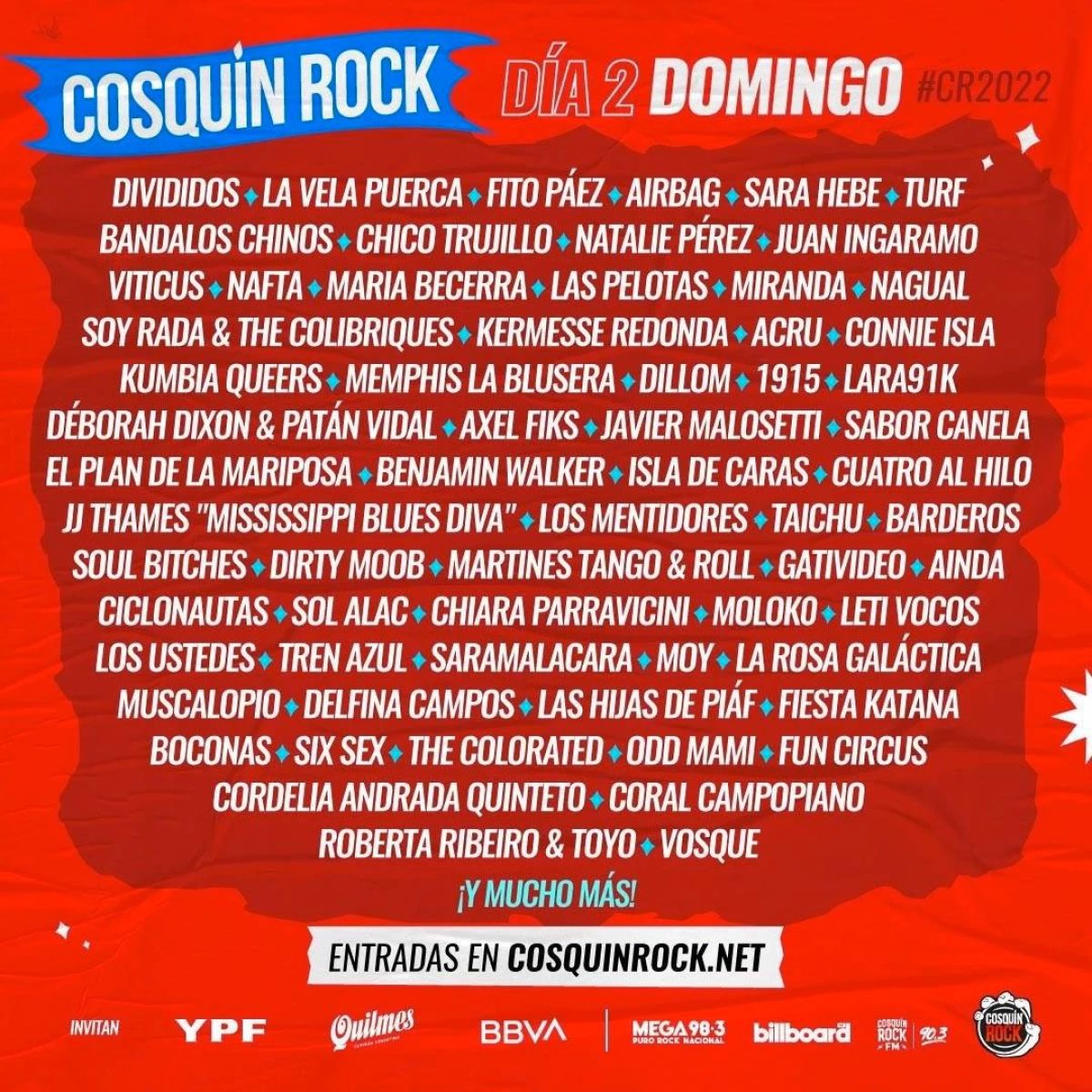 En tanto, el domingo 13, se presentarán Divididos, La Vela Puerca, Fito Páez, Airbag, María Becerra y Soy Rada, así como también Miranda, Memphis La Blusera, Natalie Pérez y Juan Ingaramo, entre otros.