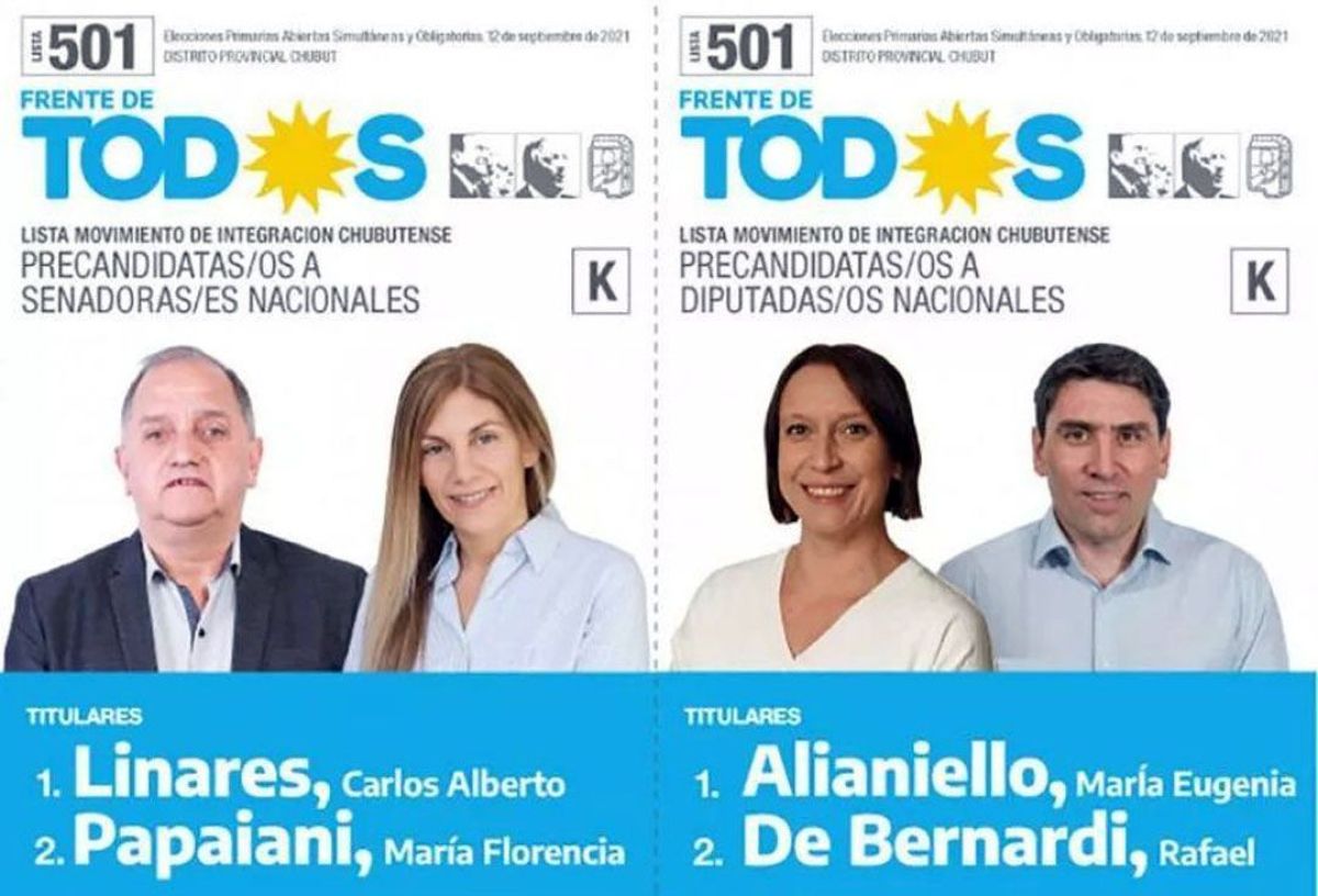 En tanto, el oficialismo nacional, Frente de Todos, lleva al exintendente de Comodoro Rivadavia, Carlos Linares y la exdiputada provincial Florencia Papaiani como candidatos a senadores, y a María Eugenia Alianello y Rafael De Bernardi como candidatos a diputados.
