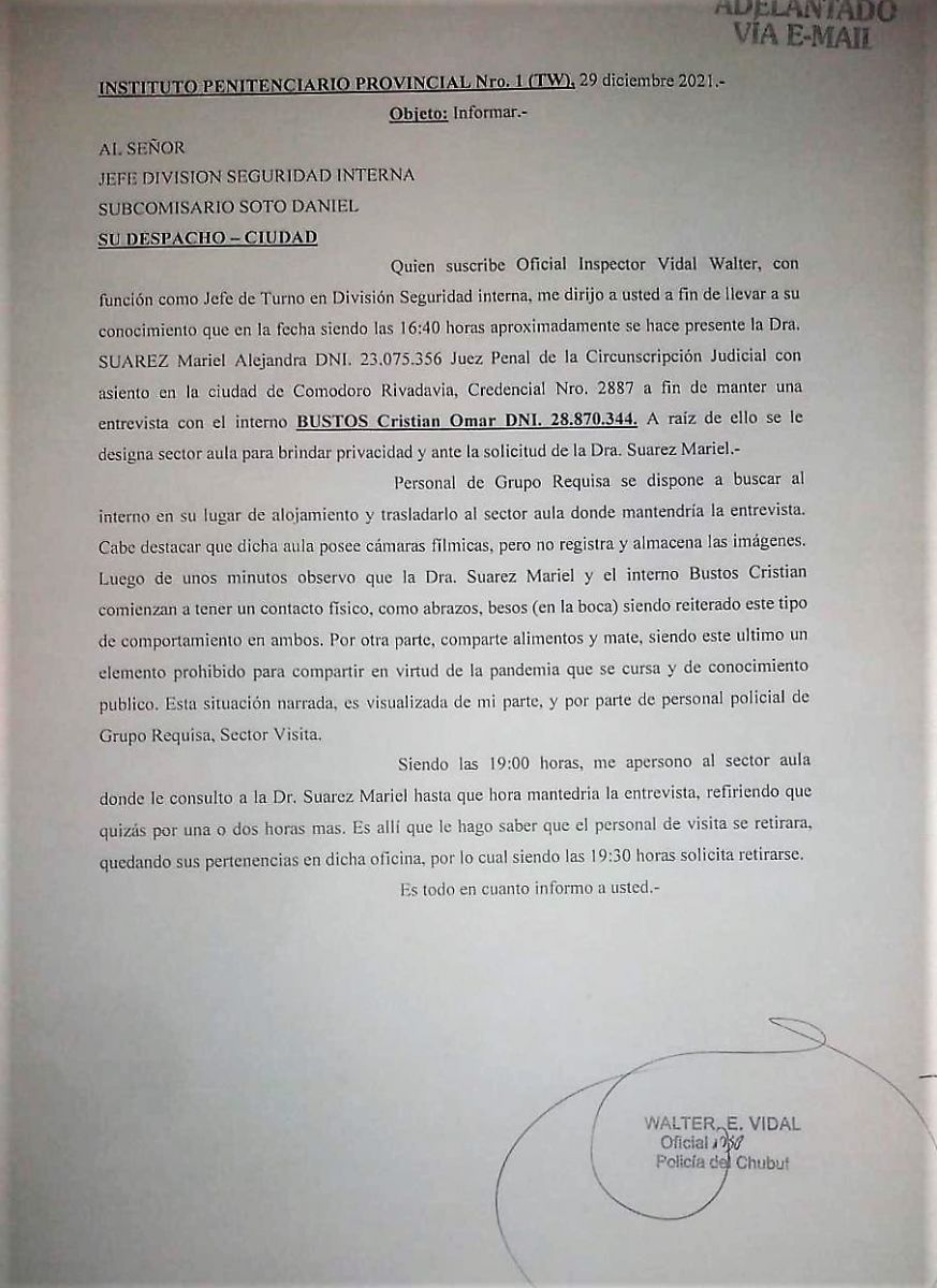 El informe, del que se hicieron eco la mayoría de los medios de la zona; que es firmado por el policía que lo hace, dirigiéndolo “al jefe División Seguridad Interna del penal, el subcomisario Daniel Soto” dice lo siguiente: “Quien suscribe se dirige a usted a fin de poner en su conocimiento que en la fecha, siendo las 16,40 aproximadamente, se hace presente la doctora Suarez Mariel Alejandra, juez Penal de la circunscripción judicial con asiento en la ciudad de Comodoro Rivadavia a fin de mantener una entrevista con el interno Bustos Cristian Omar. A raíz de ello se le designa sector aula para brindar privacidad y ante la solicitud de la doctora Suarez Mariel”, indica.