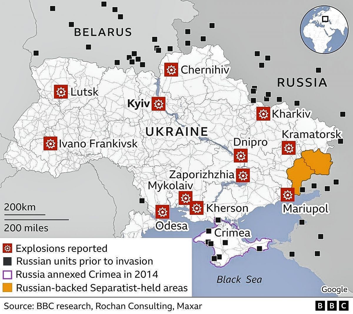 Según funcionarios ucranianos, la ola inicial de bombardeos parecían ser misiles lanzados desde crucero, artillería e incursiones aéreas dirigidas a infraestructura militar y posiciones fronterizas, incluidas bases aéreas.
