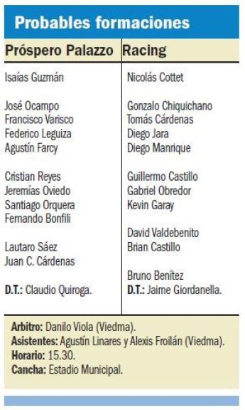 En el Estadio Municipal y a partir de las 15:30, Próspero Palazzo enfrentará a Racing de Trelew, en el marco de la final provincial del Torneo Clasificatorio que organiza la Federación Patagónica. Será el partido de ida. El vencedor de esta final jugará el Regional Federal. Danilo Viola, de Viedma, será el juez principal.