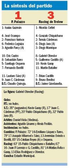 Con el oficio propio que le anexan sus integrantes, Racing de Trelew ganó en Comodoro. Superó tres a uno a Próspero Palazzo y dio un paso enorme hacia la posibilidad de convertirse en protagonista del próximo Torneo Regional Federal.