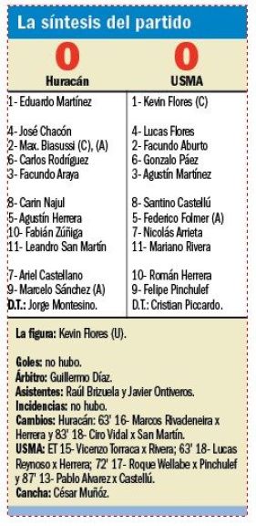 Desde los costados se insinuó Huracán y si no fuese por la poca fortuna al definir y el gran accionar del arquero Kevin Flores, hubiese podido irse al descanso con ventaja a favor con las cuatro situaciones de gol que creo. En el complemento se equilibró la tenencia de pelota, sobre todo por los cambios que introdujo Piccardo y hubo mucha lucha en el medio campo; pero nada de goles. En un partido que se mostraron ganas y juego asociado, faltaron los goles y aunque a USMA le sirve el punto para escapar de los lugares de abajo, a contra cara a Huracán lo aparta de su objetivo porque ahora está tercero y a seis puntos del líder Comisión de Actividades Infantiles.