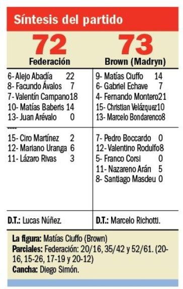 Anoche en el Diego Simón comenzó mejor el visitante, haciéndose fuerte en el juego interno y también con algunos aciertos desde el perímetro, sin embargo en el local apareció el volátil juego de Valentín Campano y pudo equilibrar algo el juego interno, y así levantó para dar vuelta la historia y quedarse con el primer parcial, sin embargo en el segundo Brown tuvo una mayor regularidad y con la acertada y goleadora conducción de Matías Ciuffo, comenzó a establecer importantes diferencias que le dieron el liderazgo del juego y del marcador.