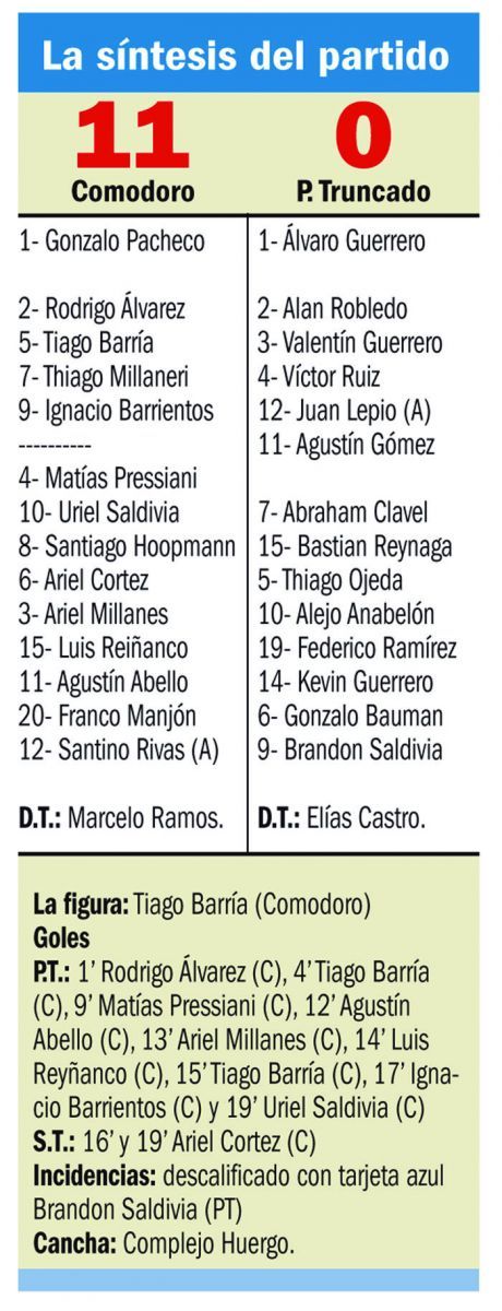 Con una actuación contundente, sin ningún tipo de inconvenientes y que le permitió “cuidar” a varios integrantes del plantel para el vital cruce de esta noche, Comodoro elaboró una nueva goleada que la firmó en el primer tiempo con el nueve a cero parcial.