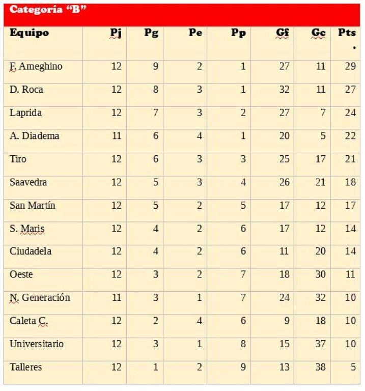 Al igualar en cero frente a Laprida, Florentino Ameghino no pudo festejar el título del torneo Apertura de la Categoría B y deberá ir a buscarlo el fin de semana que viene cuando visite a Oeste. En tanto que Deportivo Roca superó dos a uno a Ciudadela y, de esa manera, se mantiene expectante con la posibilidad de pelear el campeonato.