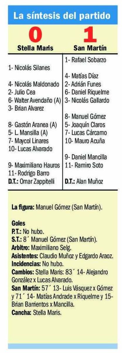 Un gran triunfo conquistó San Martín frente a Stella Maris por la mínima diferencia, con gol de Manuel Gómez, el cual lo justificó por lo realizado en el complemento.