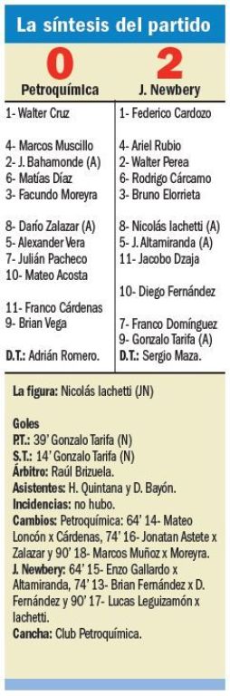 Jugando de visitante y sin el apoyo de su hinchada, Jorge Newbery venció a Petroquímica por 2-0 con goles de Gonzalo Tarifa en dos ocasiones, por la 12º fecha. Y si bien el equipo “Verdolaga” tuvo algunas oportunidades claras para descontar, no estuvo certero al momento de la definición.