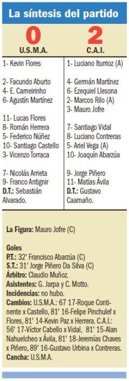 El propósito de U.S.M.A. de evitar que C.A.I. accione sus circuitos, se fue fortaleciendo con el paso de los minutos, pero al mismo tiempo carecía de peso ofensivo como para acompañar el esfuerzo que evidenciaban Nicolás Arrieta y Franco Antignir.