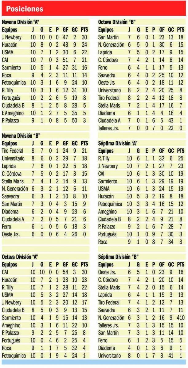 Esta vez con algunos actores especiales, como Jorge Newbery líder e invicto en novena, Rada Tilly y el propio Newbery en séptima, acompañados por los clubes que siempre son sinónimo de ser competitivos como Usma, C.A.I., Huracán y Deportivo Sarmiento. En la zona “B” el panorama es aún más parejo, puesto que Tiro Federal se muestra como puntero en novena, San Martín en octava y Oeste en séptima, reflejando cada división un panorama muy atractivo en los cruces, esperando cerrar la parte inicial del torneo, en la mejor posición posible, si bien más de alguno especula con evitar algún cruce que lo pueda dejar afuera del objetivo final, por lo menos en lo que resta del torneo.