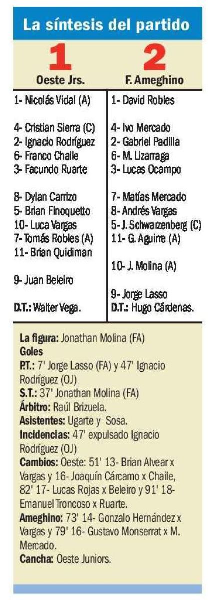 Desde un lateral nació la jugada para que la peine el ingresado Gustavo Monserrat y la pelota le caiga a Lasso que de "chilena" infló la red, pero en la pirueta estaba adelantado y el gol fue anulado. Con otro centro de la derecha de cabeza volvió a marcar "Poppy" pero otra vez el banderín arriba, bien levantado todas las veces por Marcelo Ugarte, dejaba el partido igualado y hasta ese momento con un probable desempate para definir al campeón, porque llegaban noticias que Deportivo Roca goleaba 3 a 0 en su juego ante Caleta Córdova e igualaba en puntos a Ameghino. Pero a los 37', entre mucha emotividad y dramatismo deportivo, se detonó la algarabía para el foráneo cuando Jonathan Molina desde la izquierda aprovechó su buena pegada con la pierna derecha y la ayuda del viento que molestó de costado en la tarde sabatina, ubicó la pelota junto al palo derecho del arquero Nicolás Vidal, quien poco podía hacer ante la hermosa comba que tomó la pelota. “Golón” nuevamente para el 2 a 1 que no se modificó porque en el balón detenido que tuvo Oeste la definición en el área chica se fue por arriba del travesaño, casi besando el poste y porque el ingresado Gonzalo Hernández y Monserrat, increíblemente, no le dieron dirección de red a su definición cuando solo debían empujar la pelota para liquidar el partido. Ganó finalmente 2 a 1 Ameghino, gritó campeón y no dio la vuelta para evitar posibles conflictos, recibió la copa de manos del Presidente de la Liga de Fútbol Comodorense, Ariel Bordeira, en el vestuario, para luego ir a festejar con tranquilidad el merecido logro en las instalaciones de su club.