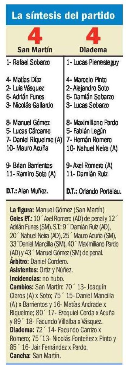 San Martín y Argentinos Diadema fueron protagonistas de un emotivo encuentro que terminó igualado 4 a 4, donde la mayor emoción se vivió en el complemento.