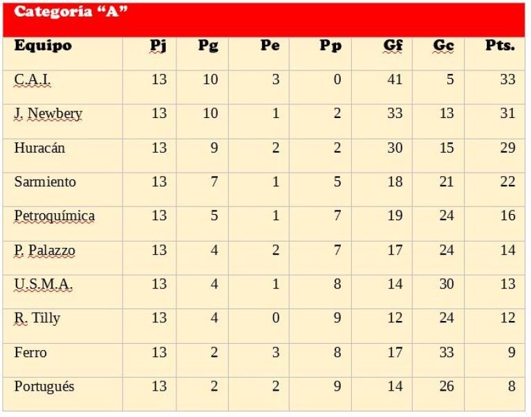 Luego de vencer dos a cero a U.S.M.A., Jorge Newbery quedó a solo dos unidades del líder C.A.I., al completarse una nueva jornada de la Categoría A. También Huracán se afianza como tercero al golear seis a uno Ferro, mientras que los restantes ganadores de hoy fueron Rada Tilly y Deportivo Portugués.