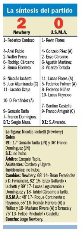 Jorge Newbery quedó a solo dos unidades del líder C.A.I. luego de ganarle ayer dos a cero a U.S.M.A. con los tantos de Gonzalo Tarifa y Franco Domínguez. Fue el sexto éxito consecutivo, en una racha donde hizo 18 goles y solo le convirtieron 1.