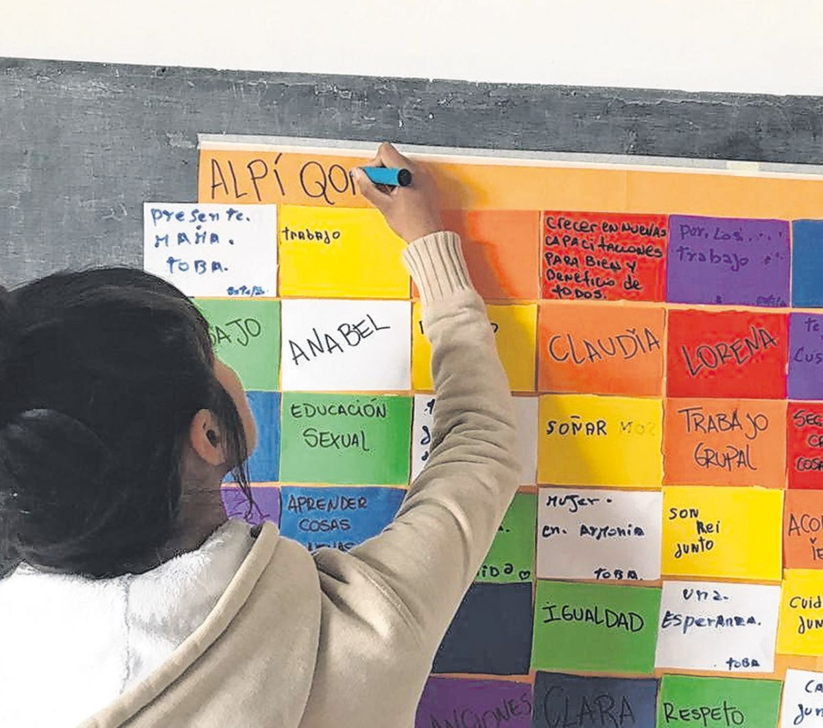 “El desafío hoy de las mujeres es ocupar los espacios que nos corresponden, que nuestras compañeras hablen, participen y tomen decisiones; volver a la conciencia de amor y cuidado, de nuestros saberes ancestrales. Por eso tenemos el espacio comunitario Centro Marka-Wasi , transmitimos nuestros saberes y cuidamos en comunidad a los niños y niñas ofreciendo apoyo escolar, talleres de horticultura, cerámica, transmisión de la lengua y simbología quechua y guaraní; participan de las ceremonias para la Pacha”.