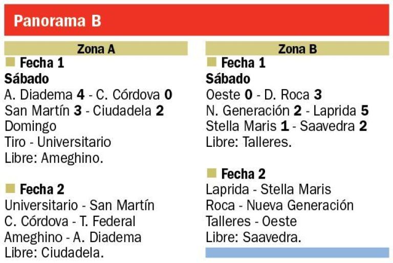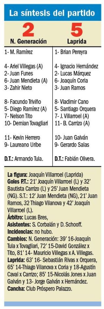 Laprida le ganó por un contundente 5-2 a Nueva Generación en cancha de Próspero Palazzo. Los goles fueron marcados por Juan Mendieta en dos oportunidades para la Nueva que hacía de local, mientras que por Laprida, las conquistas fueron de Joaquín Villarroel en dos ocasiones, Bautista Carrizo, Juan Ramos y Thiago Vilanova.