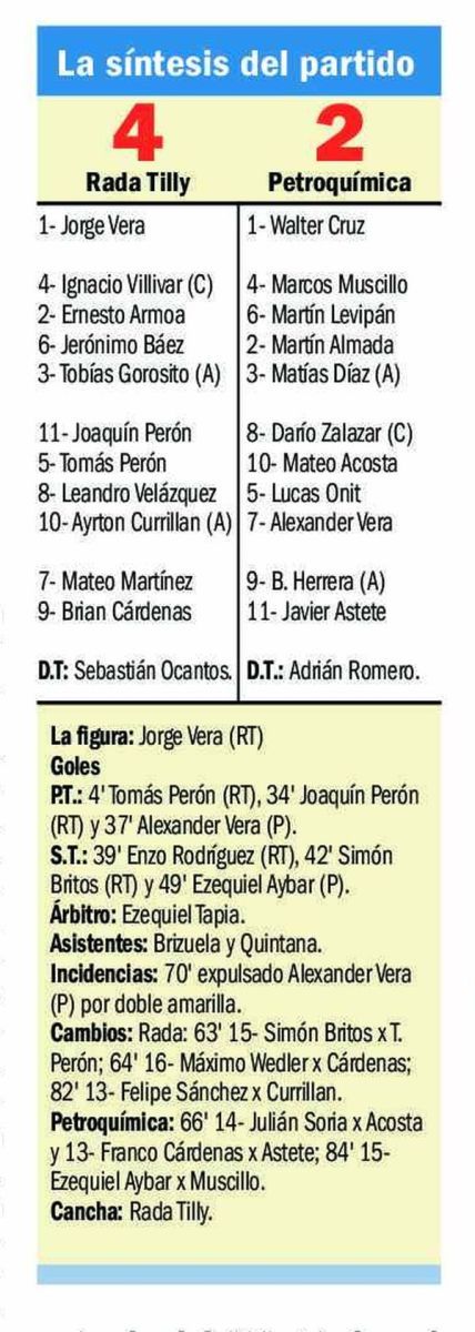 Gran juego el que se vivió en el inicio de la fresca tarde dominguera. Chocaron dos equipos con ambiciones en los tres puntos para poder escaparle aún más a los puestos más bajo de la tabla y en consecuencia salió un partidazo que nada se ajusta con el abultado resultado porque Petroquímica pese a estar en desventaja casi desde el vestuario, buscó siempre el gol y convirtió en figura al arquero rival. Rada Tilly en el último tramo, ya con un hombre más en cancha y gracias a los cambios, terminó sentenciando un trabajado cotejo.