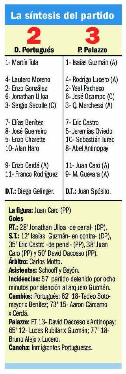 Partidazo en el "templo de avenida Chile" porque Deportivo Portugués estuvo a punto de salir del último lugar de la tabla de posiciones al ir ganando pero con mucha actitud y ante varias adversidades Prospero Palazzo culminó ganando por 3 a 2. Enzo Cerdá y Jonathan Ulloa -de penal- los goles del lusitano. Juan Cruz Caro, David Dacosso y Eric Castro -de penal- los goles para el primer triunfo bajo la conducción de Juan Spósito.