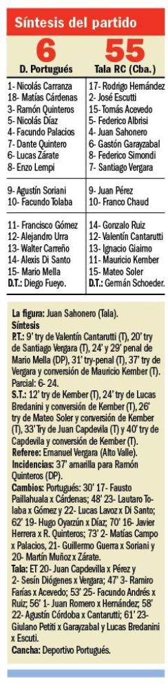 Tala RC arribó como puntero y sostuvo esa condición en cancha del “Lusitano”, porque mostró un juego muy dinámico con sus tres cuartos, acoplado para defender y muy físico, ganó en todas las formaciones fijas y solo un error de knock-on tuvo en todo el partido. Ampliamente dominador del duelo llevando en cuantiosas oportunidades el juego al scrum, desgastó a Portugués que notó ese esfuerzo físico sobre todo en los minutos finales.