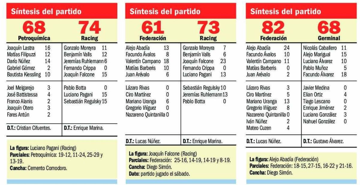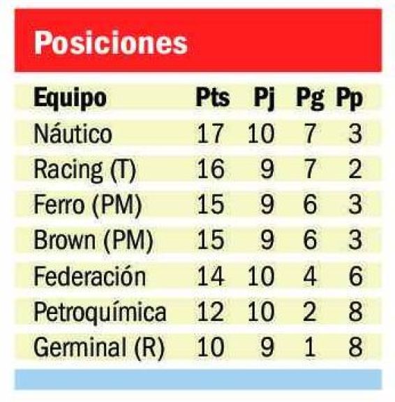 Con el triunfo del sábado frente a Ferro de Madryn por 92 a 65 y pese a la derrota de anoche ante Brown, también de la ciudad portuaria, por 88 a 78, Náutico Rada Tilly se aseguró un lugar en la definición del Final 4 que está previsto para el sábado 15 y domingo 16 del mes que viene. En tanto que anoche Federación se impuso a Germinal y se recuperó de la derrota del sábado ante Racing, en tanto que Petroquímica, tras el festejo contra Germinal, anoche fue doblegado en e Cemento Comodoro de km 8 por Racing de Trelew.