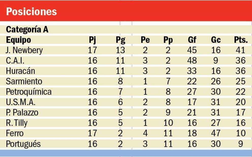 Es que con el triunfo de ayer sobre Ferro por cinco a cero, Jorge Newbery se disparó cinco puntos arriba cuando sus inmediatos perseguidores tienen seis por jugar, por eso Huracán y C.A.I. tiene que sumar esta tarde sí o sí de a tres, porque otro resultado lo marginará de la lucha por un título que lo tiene muy cerca el “Aeronauta”, porque en la próxima jornada será local del colista Deportivo Portugués, que hasta hoy solo ha ganado en dos oportunidades en el campeonato.