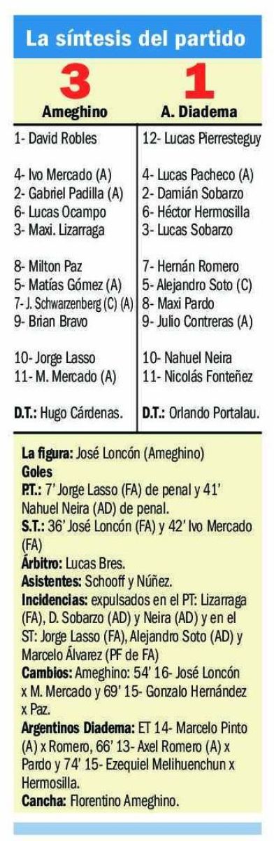En un partido friccionado, discutido, demorado y con seis expulsiones, debutó el campeón Florentino Ameghino con un tres a uno sobre Argentinos Diadema, en lo que marcó la reanudación del torneo zonal de la Categoría B.