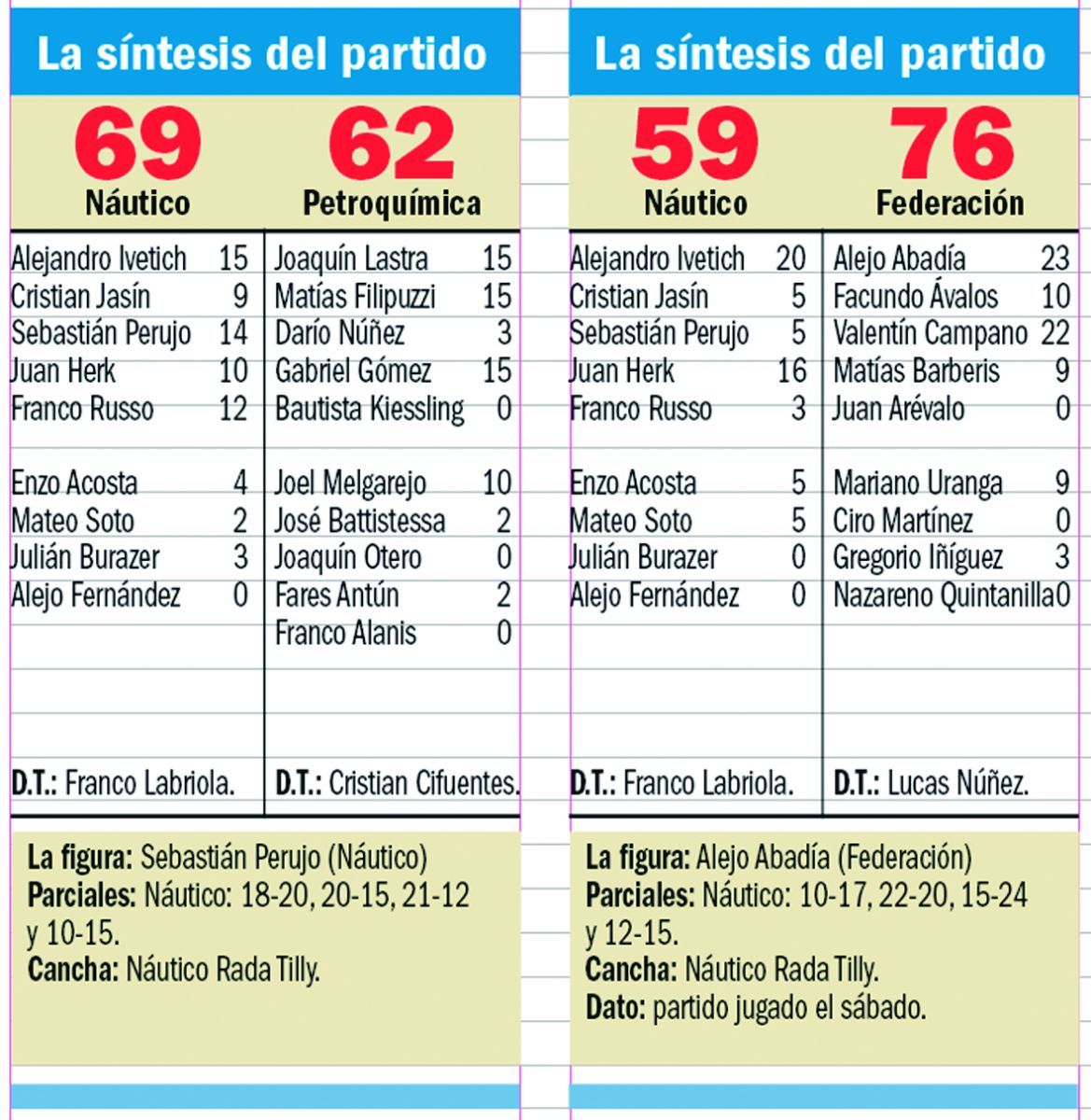 Federación se jugaba la última chance el sábado para meterse entre los cuatro primeros y fue a Rada Tilly y consiguió un muy buen triunfo de 76 a 59 sobre Náutico, pero los resultados registrados en Puerto Madryn con los éxitos de Brown y Ferro, lo dejaron sin ninguna posibilidad, pese a que todavía tiene un cotejo pendiente, que será el sábado que viene frente a Petroquímica en km 8.