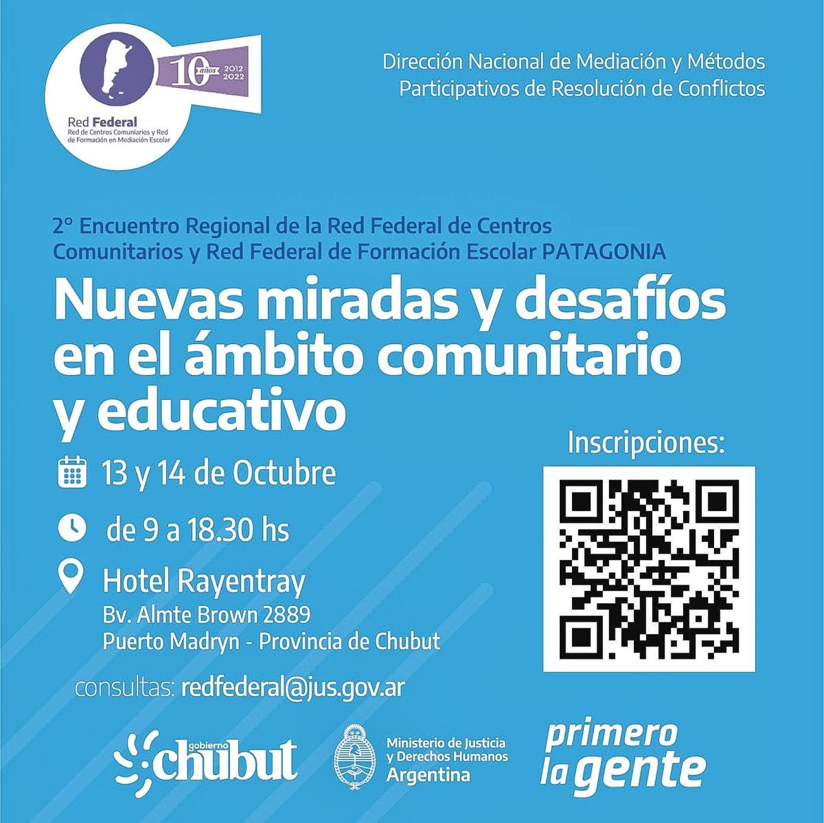 El Gobierno del Chubut, a través de la Subsecretaría de Derechos Humanos dependiente del Ministerio de Gobierno y Justicia, informó que la próxima semana se desarrollará en Puerto Madryn el 2° Encuentro Regional Patagónico de la Red Federal de Centros Comunitarios y de Formación Escolar.