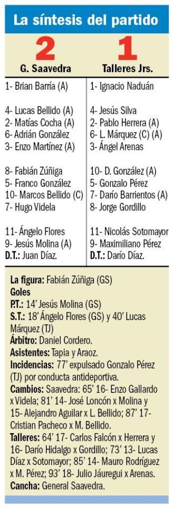 Pese a la desventaja no desistió Talleres frente a un rival que fue distinto con la pelota y sin ella, más ganas que juego del cuadro de Km 3 en un friccionado encuentro. En unas de las tantas faltas innecesarias, Gonzalo Pérez no pudo poner paños fríos, golpeó a un jugador en el suelo, el asistente Tapia informó a Daniel Cordero y el árbitro no tuvo más remedio que mostrarle la roja cuando aún quedaban 15’. Pero Saavedra estuvo lejos de volcar el trámite totalmente a su favor, en un tiro libre el ingresado Mauro Rodríguez le dio la rosca justa al centro y Márquez de cabeza puso el 2 a 1 a los 40’.