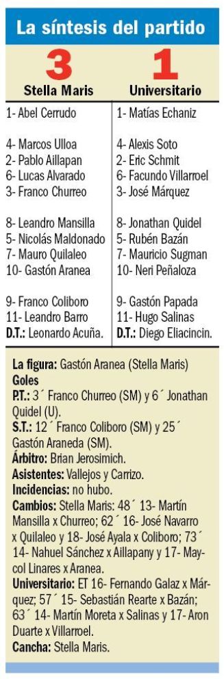 Apenas arrancó el juego sorprendió Stella Maris con una subida de su lateral Franco Churreo, que al tomar contacto con la pelota dejó sin chances al arquero Matías Echaniz.