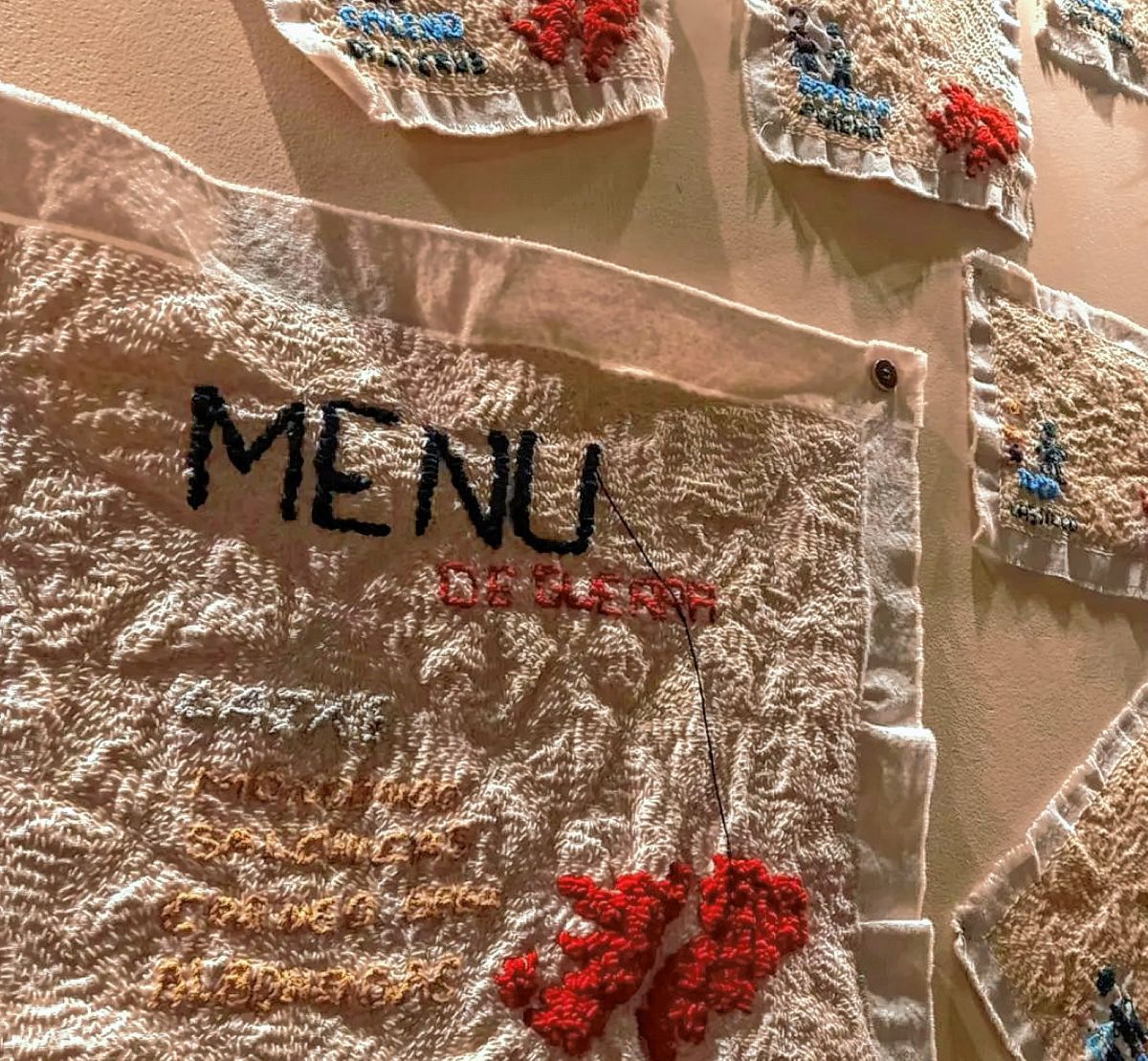 -Lo hago como un juego porque cuando bordo, el bordado me atraviesa y es como jugar a la vida, incluso con temas tan dolorosos como Malvinas. En este caso, lo primero que hice fue el soporte para las Islas. Para mí las Islas están manchadas de sangre, entonces elegí una tela grande para el mar y a las Islas las bordé en rojo. Después empecé a trabajar con la parte en que habla de su mamá y de su familia, entonces bordé personajes representando a sus familiares. También hice a sus amigos en la cancha y después fui tomando textos, bordando palabras. En plena pandemia nos cruzábamos con Marcelo en la calle haciendo mandados y él me pedía que borde el menú de guerra. El menú de guerra era la polenta, los fideos, entonces jugué con los colores y el menú tiene el mismo color que el soporte, no se distingue, representando la ausencia de comida. Después seguí con los nombres de los 39 soldados que estaban en la trinchera. Marcelo escribió todos los nombres y los apodos, con eso hice 39 servilletas con un muñeco de civil y un soldadito, como en jardín de infantes. Y ahí vuelvo a jugar irónicamente con lo que les pasó a esos jóvenes y adolescentes que estuvieron 74 días sin salir de esa trinchera, apenas comiendo, sin bañarse, mojados por las lluvias. Me gusta elegir como soporte alguna tela especial y bordo con hilo macramé, utilizando diferentes puntos, juego con eso.