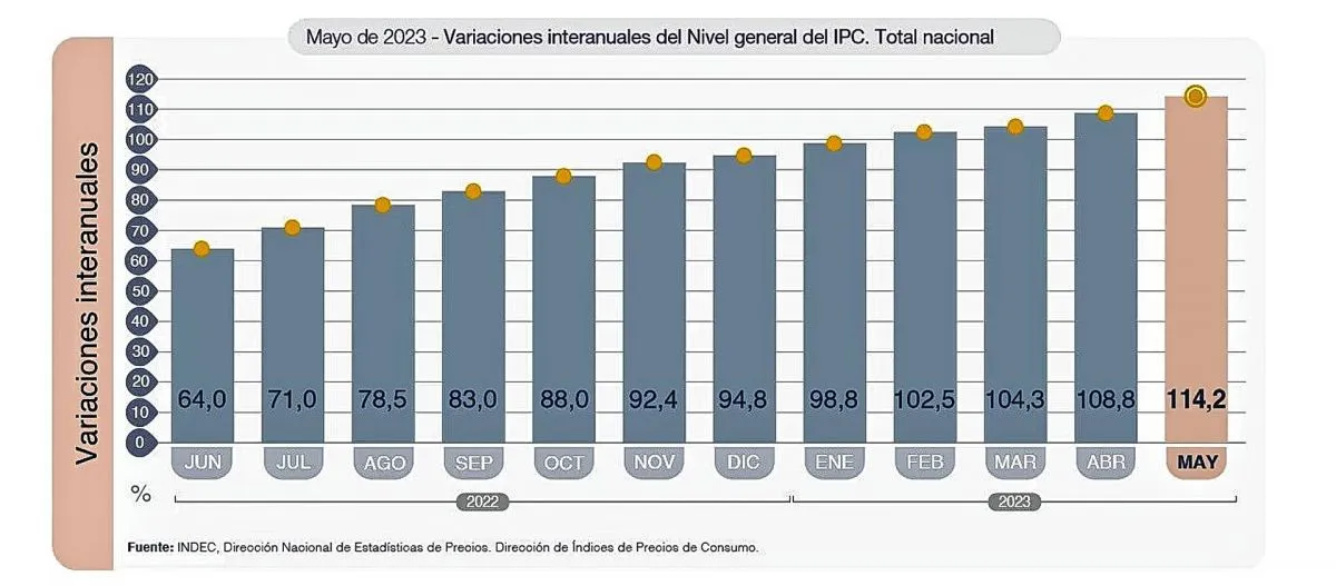 La inflación de mayo fue del 7,8%, por debajo del 8,4% registrado en abril, pero sigue en niveles altos, y anualizada llega al 114,2%, informó el INDEC.