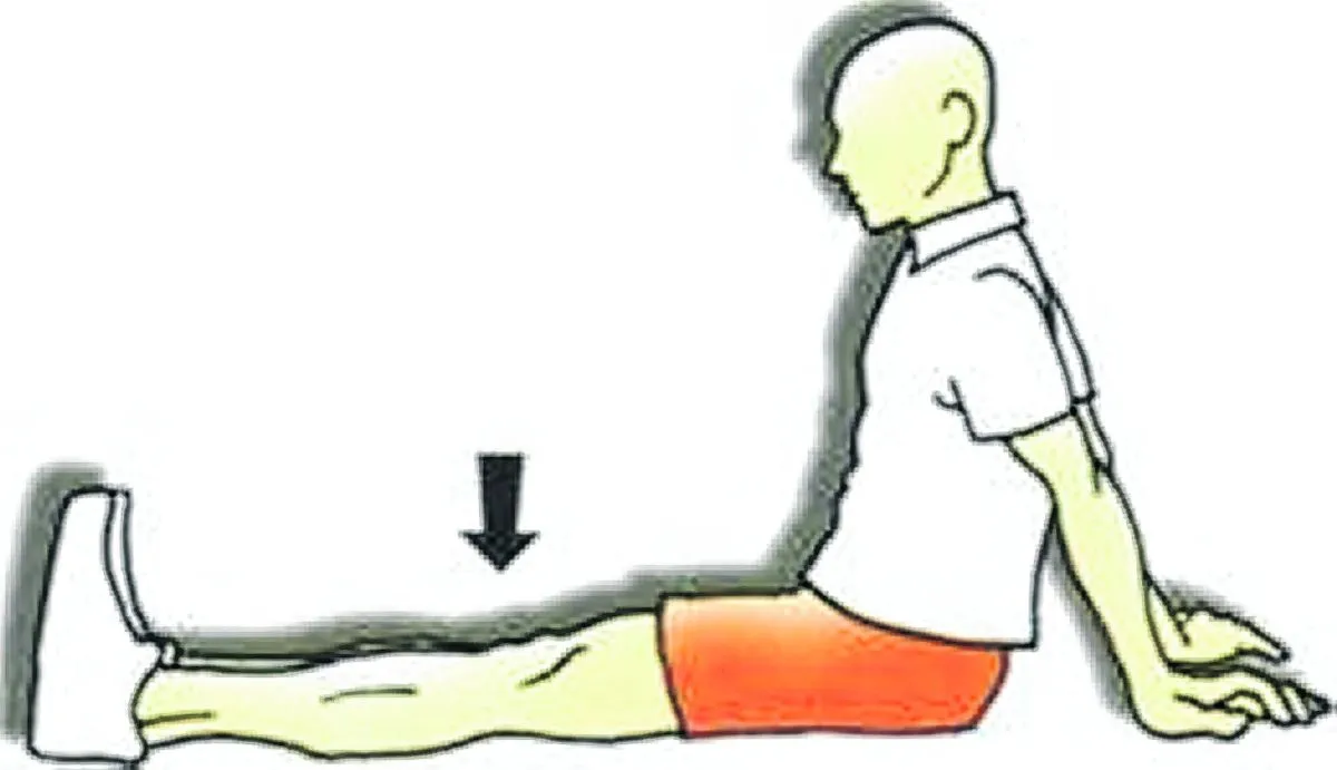 -Siéntate con las piernas estiradas y las manos apoyadas detrás de la espalda. Lleva el pie hacia arriba y aprieta fuerte rodilla y parte posterior del muslo contra el suelo sin levantar tus talones. Mantén entre tres y cinco segundos la contracción. Has de hacer fuerza con los cuádriceps, sin levantar los talones del suelo.