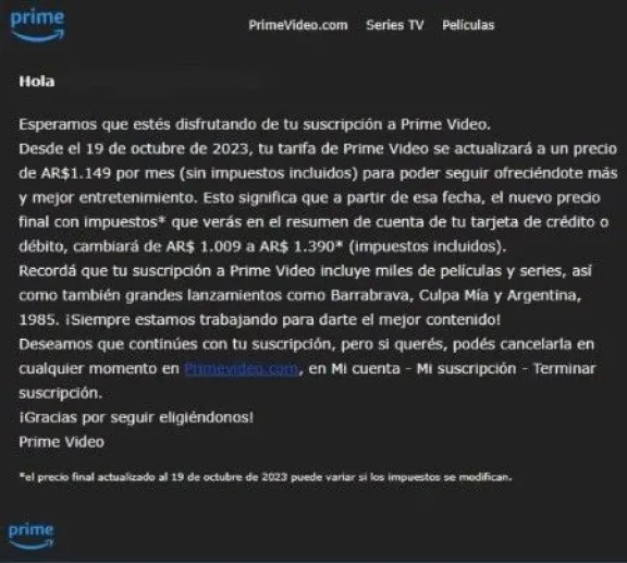 El comunicado remarca las producciones más importantes que se lanzaron: “Recordá que tu suscripción a Prime Video incluye miles de películas y series, así como grandes lanzamientos como Barrabrava, Culpa Mía y Argentina, 1985″.