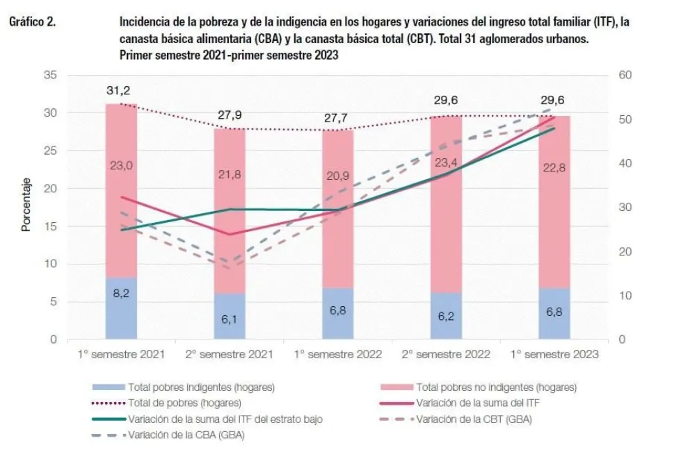 Con respecto al segundo semestre de 2022, la incidencia de la pobreza se mantuvo sin cambios en los hogares y registró un aumento de 0,9 puntos porcentuales (p.p.) en las personas. En el caso de la indigencia, mostró un aumento de 0,6 p.p. en los hogares y de 1,2 p.p. en las personas.