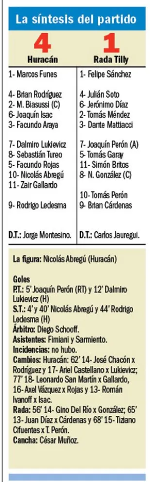 Por uno de los adelantos de la tercera fecha del torneo Zonal de Primera “A”, Huracán pudo mantener su invicto de local al reaccionar a tiempo para superar a Rada Tilly por 4 a 1. Dalmiro Lukievicz, Rodrigo Ledesma y Nicolás Abregú, en dos oportunidades, sellaron la goleada para alcanzar el primer puesto en el grupo “B”. Joaquín Perón había puesto en ventaja a los de la villa balnearia.