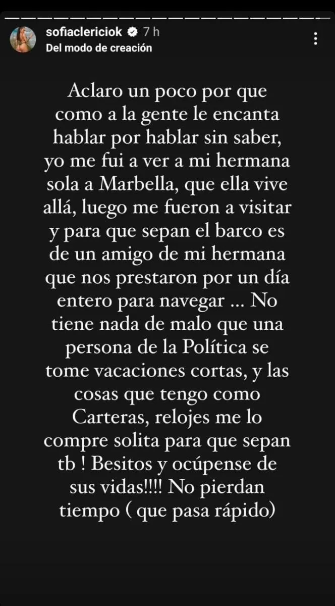 El día después de la polémica desatada por el millonario viaje que protagonizó el ahora exjefe de Gabinete de la provincia de Buenos Aires, Martín Insaurralde, la modelo Sofía Clerici, quien difundió las fotos y videos del funcionario con el que compartió estadía en la ciudad española de Marbella, hizo público un descargo a través de sus redes sociales.