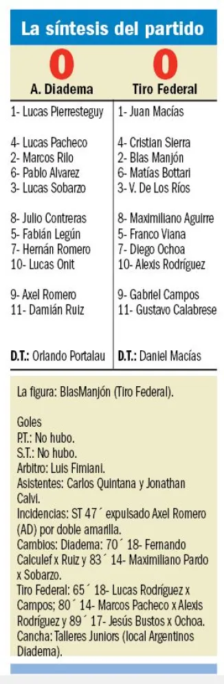 Un entretenido encuentro protagonizaron Diadema y Tiro Federal al que solo le faltó el gol, porque ambos conjuntos tuvieron sus posibilidades para concretar; pero la buena performance de los goleros y la solidez defensiva impidió que se rompiera el cero.