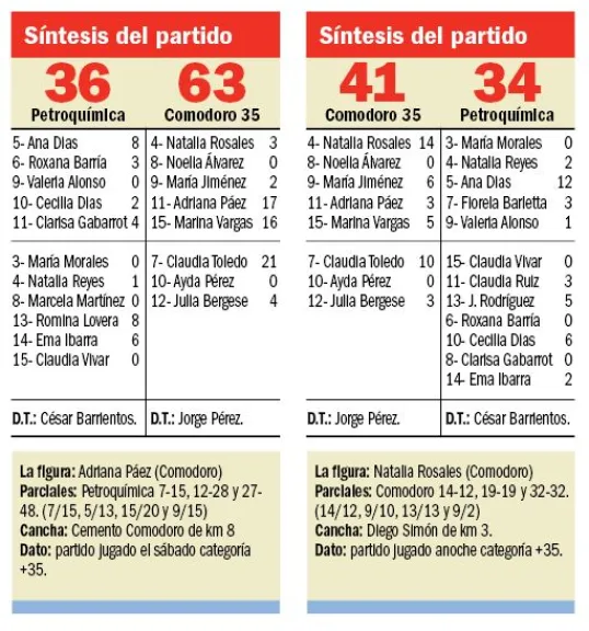 Comodoro 35 le ganó los dos partidos a Petroquímica por la categoría +35 de la Liga Master de básquetbol femenino que organiza la Confederación Argentina, en fechas que se desarrollaron durante el fin de semana en el Cemento Comodoro y en el Diego Simón.