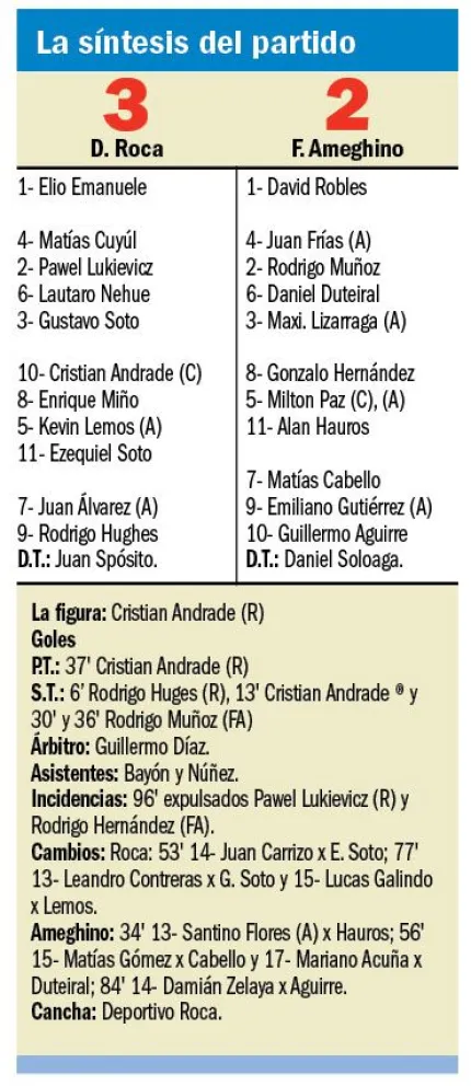 Chocaron dos equipos en un cotejo de esos que se denominan de seis puntos, ya que ambos quieren escaparle al descenso y a la reválida. Un poco más ambicioso Roca, que pudo ponerse tres goles en ventaja, pero reaccionó Ameghino para ponerle suspenso al epílogo, descontó en dos ocasiones y hasta tuvo el empate, pero el que terminó festejando el triunfo fue el local, que, aunque ya no tiene margen de error, sueña con poder escaparle al último lugar de la tabla general.