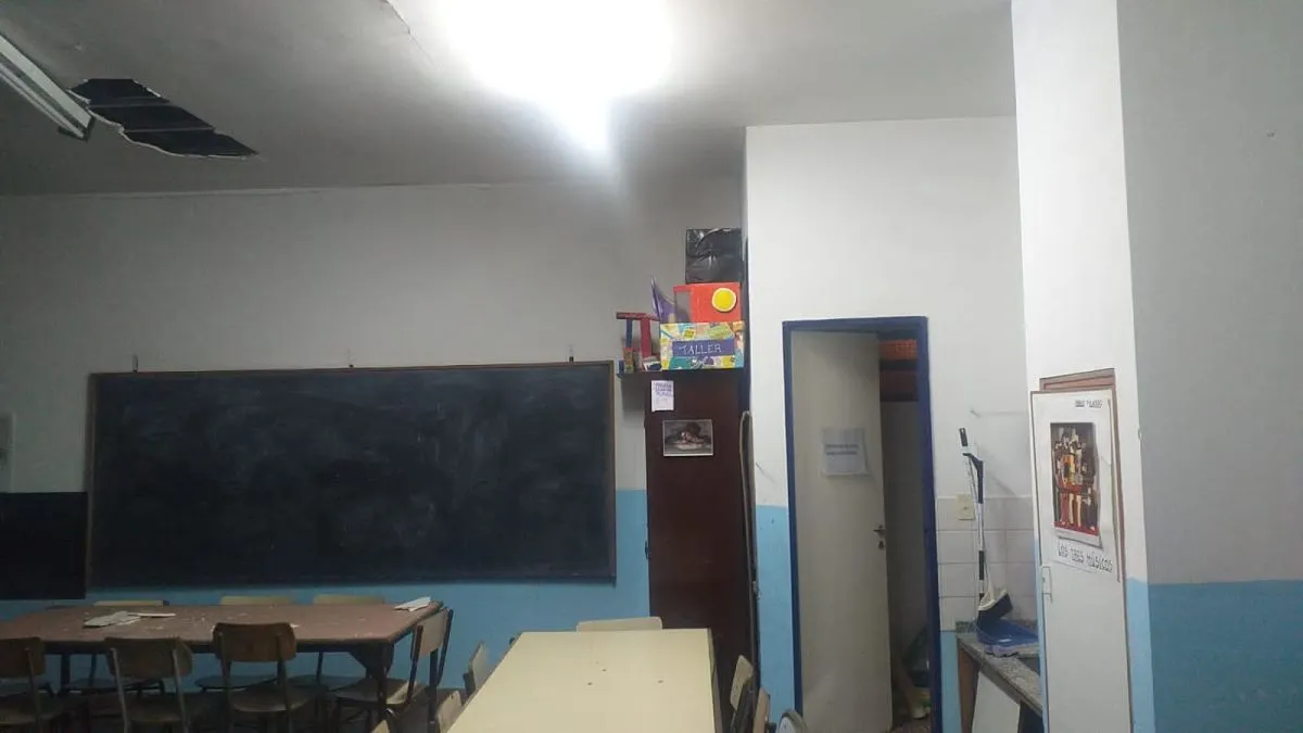 Asimismo, se constató que ingresaron por el techo del aula de plástica de la escuela primaria, donde provocaron daños en el cielo raso y una marca en la pared de afuera de una de las aulas, además de grafitis en las paredes.