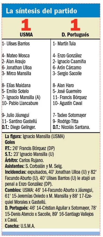 La situación estaba acomodada para Deportivo Portugués. Porque en el primer tiempo ganaba 1-0, tenía un hombre más y un penal, a cinco minutos de terminar el primer tiempo. Pero no lo definió, USMA se reacomodó, empató y defendió el punto hasta el final.