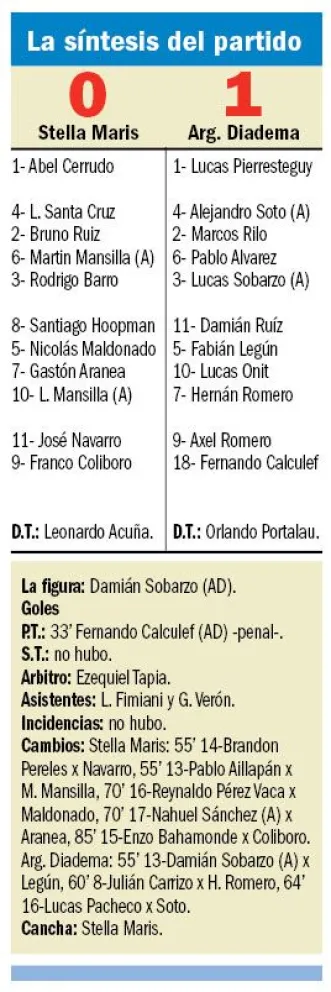 En un trámite friccionado, áspero, intenso y con escaso espacio para las maniobras ofensivas, Argentinos Diadema ganó por un penal convertido por Fernando Calculef en la primera parte del juego.