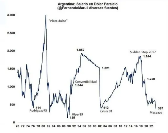 De hecho, un estudio del economista Fernando Marull muestra que, si se toma en cuenta la evolución del salario real en dólares, se puede concluir que el nivel actual, que se ubica en torno a US$397 es similar al percibido tras la Guerra de Malvinas en 1982 y ya perforó el piso de dos de las peores crisis de los últimos cincuenta años.