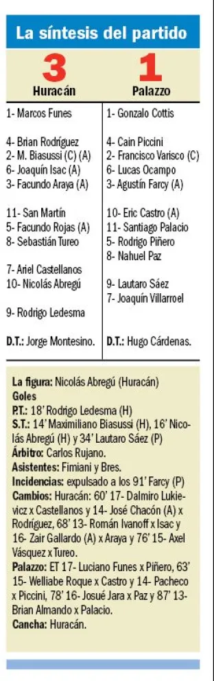 Con una ráfaga de pleno dominio y goles durante los primeros 15 minutos del complemento, Huracán derrotó tres a uno a Próspero Palazzo, quedando al frente de las posiciones de la Zona B de la Categoría A. Debutaron algunas de las incorporaciones que realizó para afrontar el Regional.