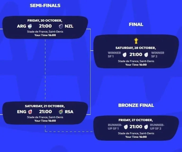 Con los triunfos de Inglaterra y Sudáfrica ya consumados durante este domingo por la tarde, las semifinales del Mundial de Rugby Francia 2023 tendrán lugar este viernes 20 y sábado 21 de octubre en París, en el Stade France, donde serán también la sede de la final y del partido por el tercer puesto.