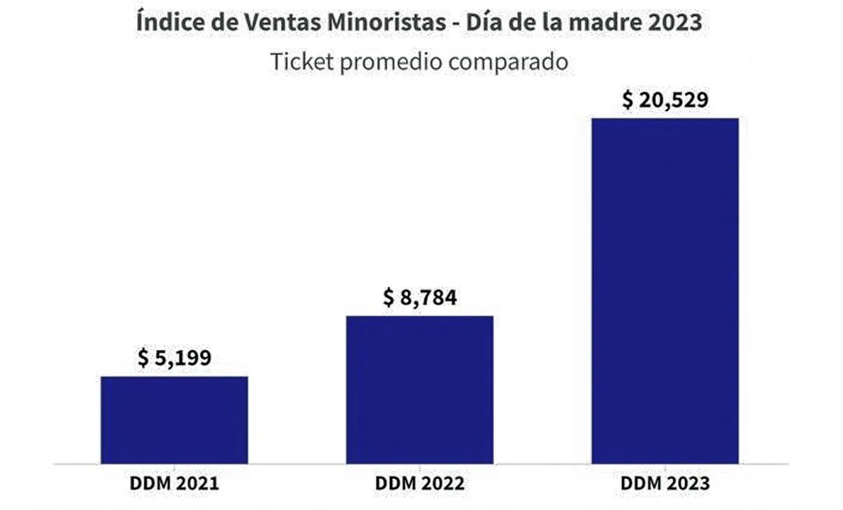Según el Índice de ventas, y comparando estas cifras, el ticket promedio para el Día de la Madre en 2021 fue de $5,199, en 2022 de $8,784 y dispara en 2023 siendo de $20,529.