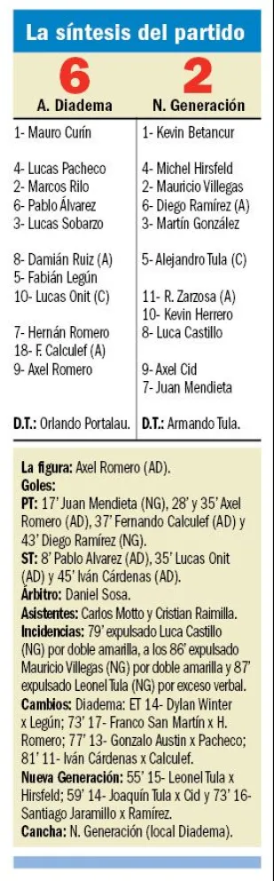 Fue certero Diadema y a los 37’ explotó velocidad y gambeta Damián Ruíz, para desbordada por derecha y realizar el buscapié entre varios defensores, pero el que llegó a empujar fue Fernando Calculef para el 3 a 1. Nunca bajó los brazos Nueva Generación, Herrero recuperó en la medialuna, luego de un centro en el tiro libre que no prosperó, la abrió al lado zurdo dónde esperaba Martín González- de lo más destacado en gambeta- y este al desbordar sacó el centro al segundo palo, justo donde esperaba el ex Universitario y San Martín, Diego Ramírez para descontar de cabeza y el 3 a 2 con el que cerró el primer tiempo.