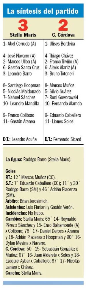 El partido se hizo interesante porque ambos buscaban la victoria; pero pasaban los minutos y parecía que todo iba a quedar empardado. Hasta que en el tiempo adicional llega un tiro de esquina para Stella Maris, lo ejecuta Leandro Mansilla y Adrián Piacenza se anticipa a todos en el primer palo para conectar el gol de la victoria, y desatar la locura en los dueños de casa, para volver a ganar después de una dura derrota ante Tiro Federal.