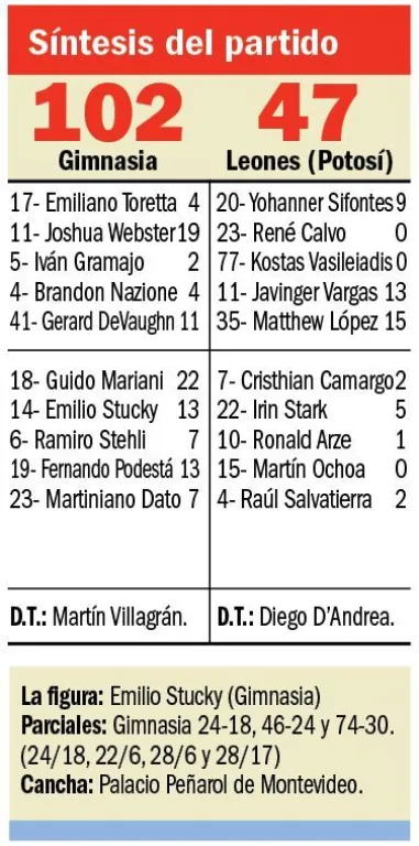 Una aplastante victoria consiguió anoche Gimnasia al vencer 102 a 47 a Leones de Potosí, Bolivia, y se jugará todas las chances de avanzar a la siguiente fase al enfrentar hoy al local y candidato Peñarol, cuando se dispute la última jornada del Grupo B de la Liga Sudamericana de básquetbol que finalizará en Montevideo, Uruguay.